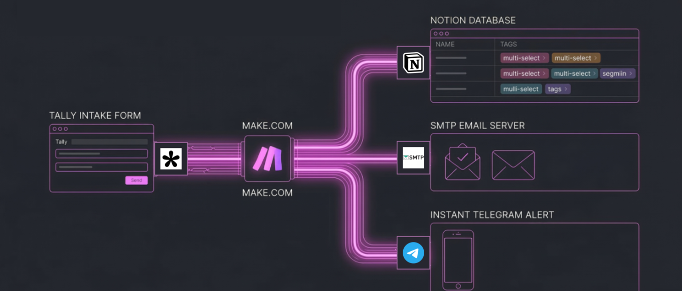 To fully automate a high-ticket B2B Go-To-Market inbound pipeline, I integrate a smart data-capture trigger, an API routing engine, and a dynamic CRM. In this specific architecture, I utilize a webhook-based Tally form to instantly route multi-select JSON data payloads through Make.com. My logic processor simultaneously logs the lead into a Notion database, sends a white-labeled SMTP confirmation email via my custom cPanel domain, and pings my phone using the Telegram Bot API. This completely eliminates manual data entry, guarantees zero data leakage, and reduces my lead response time to less than one second, optimizing the entire product marketing funnel.